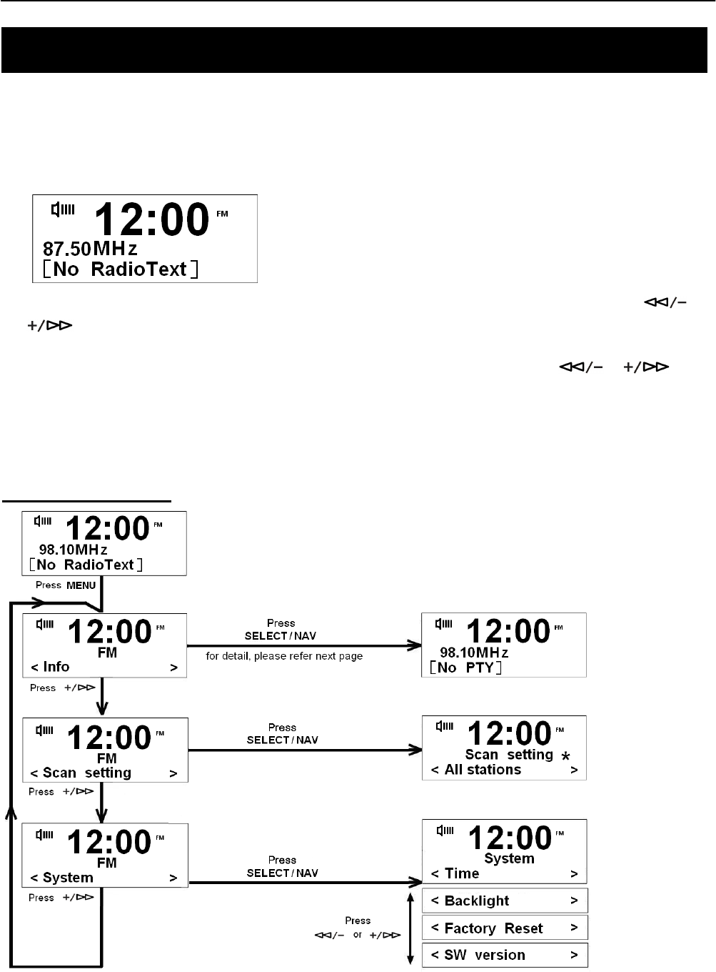 4. To auto-search in FM Mode, press the SELECT/NAV Button and then press and hold the or